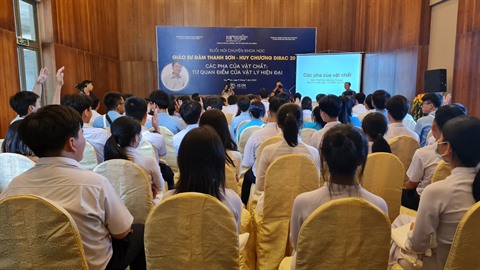 Lundi après-midi, le Professeur Dàm Thanh Son, de l’Université de Chicago (États-Unis), médaille Dirac en 2018, donne une conférence publique portant sur les "États de la matière : du point de vue de la physique moderne" à l’attention d’une soixantaine d’étudiants d'élite de Binh Dinh, Quang Ngai, Phu Yên et Gia Lai.