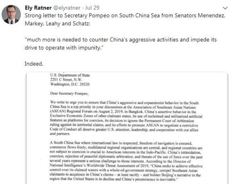 Dans leur lettre, dont une copie a été publiée sur la page Twitter de l’ancien conseiller adjoint à la sécurité nationale de l’ancien vice-président Joe Biden, Ely Ratner, les sénateurs ont exhorté le secrétaire d’État américain à veiller à ce que le comportement agressif et expansionniste de la Chine dans la Mer Orientale soit l’une des priorités de ses discussions lors du Forum régional de l’ASEAN prévu le 2 août 2019 à Bangkok.