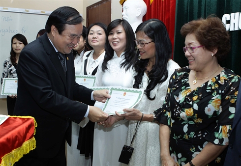 | Le vice-ministre de l’Éducation et de la Formation, Trân Quang Quy, remet le certificat de participation après une formation sur les méthodes d’apprentissage du vietnamien aux enseignants +Viêt kiêu+. |