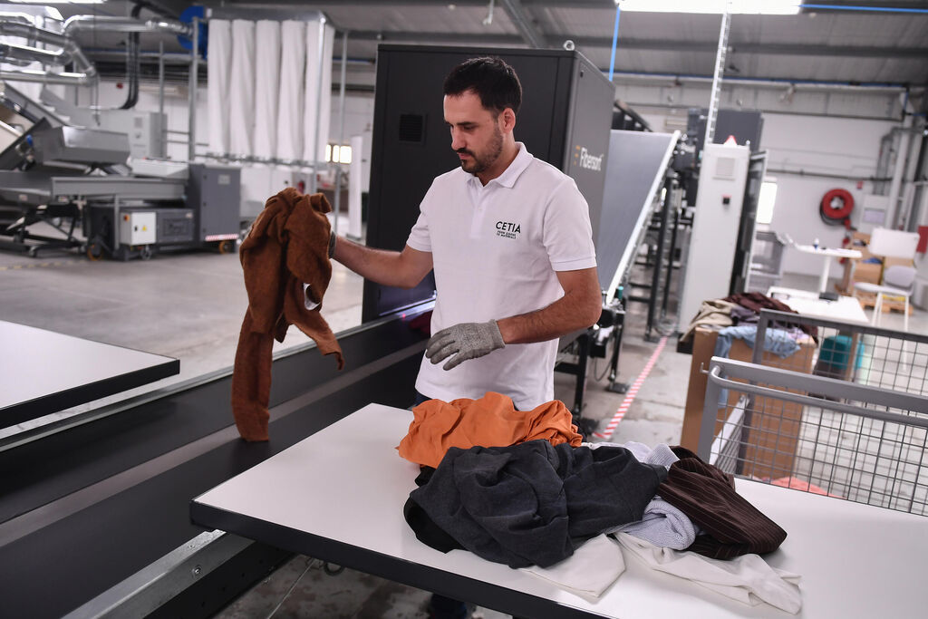 | Un employé place des vêtements usagés sur une machine de tri sur le site du Cetia à Hendaye, dans les Pyrénées-Atlantiques, le 4 septembre. |