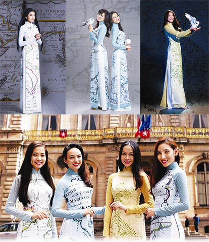 | Des áo dài du styliste Thuân Viêt avec l’image de la carte du Vietnam affirmant sa souveraineté sur les archipels de Hoàng Sa et Truong Sa. |