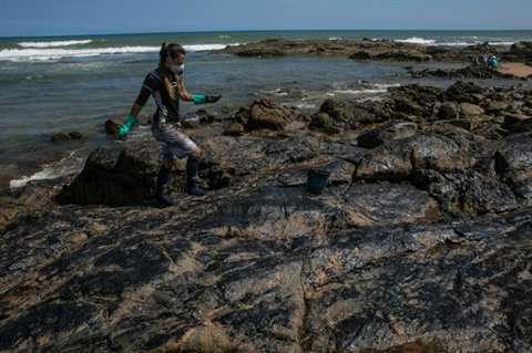 | Une volontaire participe au nettoyage de la côte polluée aux hydrocarbures, le 19 octobre à Salvador de Bahia, au Brésil. |