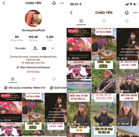 Créée en juillet dernier, la chaîne TikTok de Chao Thi Yên, une fille de l’ethnie Dao dans le district de Bat Xat de la province de Lào Cai (Nord), compte près de 213.000 abonnés et quatre millions de "likes". Cette tiktokeuse a étudié en Allemagne pendant deux ans avant de retourner dans son pays natal pour travailler. Elle est actuellement membre d’une organisation non gouvernementale spécialisée dans les ressources forestières.