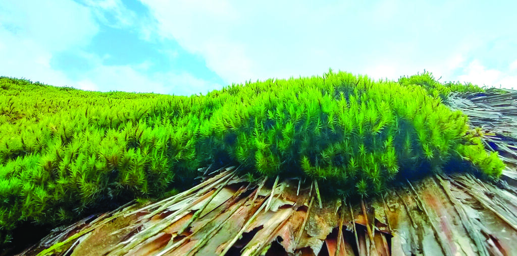 | Toit couvert de mousses d’une maison sur pilotis avec un bel ensoleillement. |