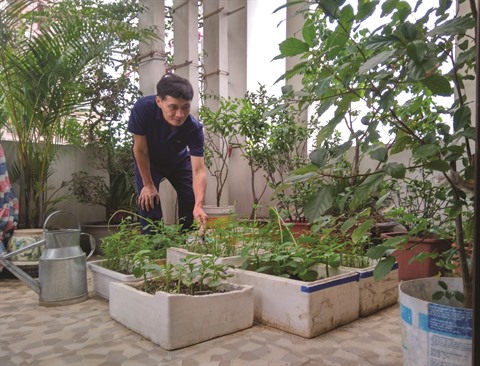 Nguyên Minh Hai, 62 ans, et Nguyên Thi Minh Hiên, 60 ans, fonctionnaires, cultivent depuis deux ans un jardin sur la terrasse de leur maison de cinq étages dans le district de Hà Dông, à Hanoï. Leur première tâche chaque jour est de se lever tôt et d’aller au jardin pour y travailler pendant une heure. L’après-midi, le couple passe également une autre heure à s’occuper du jardin. Ils plantent différentes sortes de légumes selon la saison, ainsi que des fleurs et même des fruits. ''En été, je me concentre sur les épinards et la moutarde brune'', partage M. Hai.