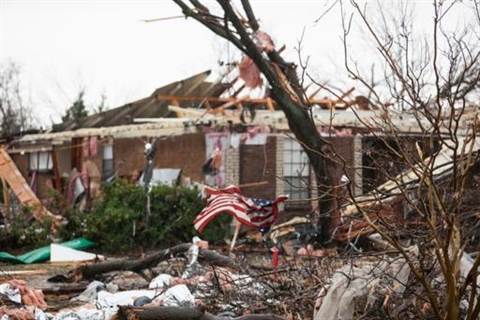 | Le drapeau américain au milieu de maisons détruites le 27 décembre à Rowlett au Texas. |