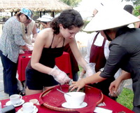 | Touristes étrangères essayant de confectionner des "bánh chung" lors du 12e festival annuel dédié à ce fameux gâteau carré de riz gluant, tenu dans la ville de Phan Thiêt, province de Binh Thuân (Centre). |