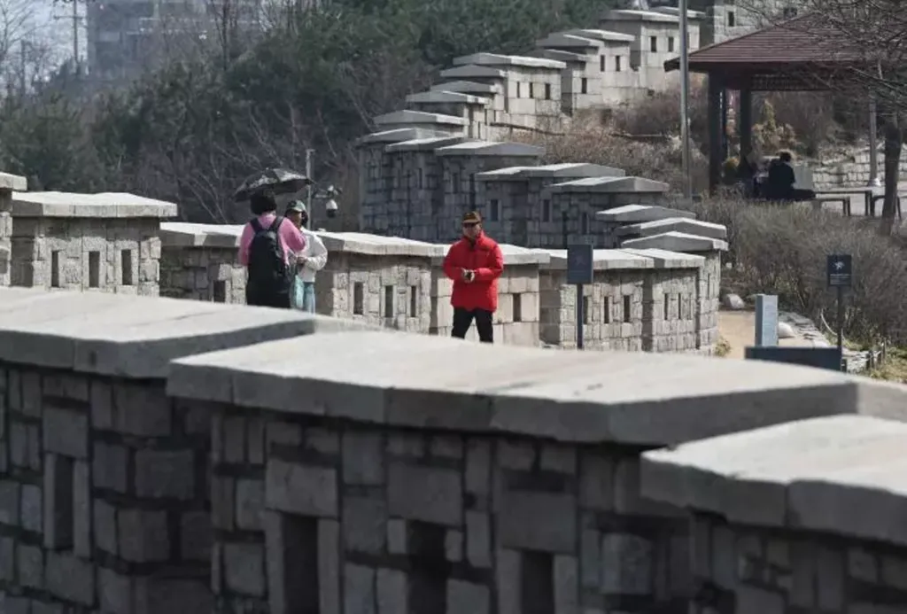 | Des promeneurs longent les remparts du parc Naksan à Séoul, le 17 mars. |