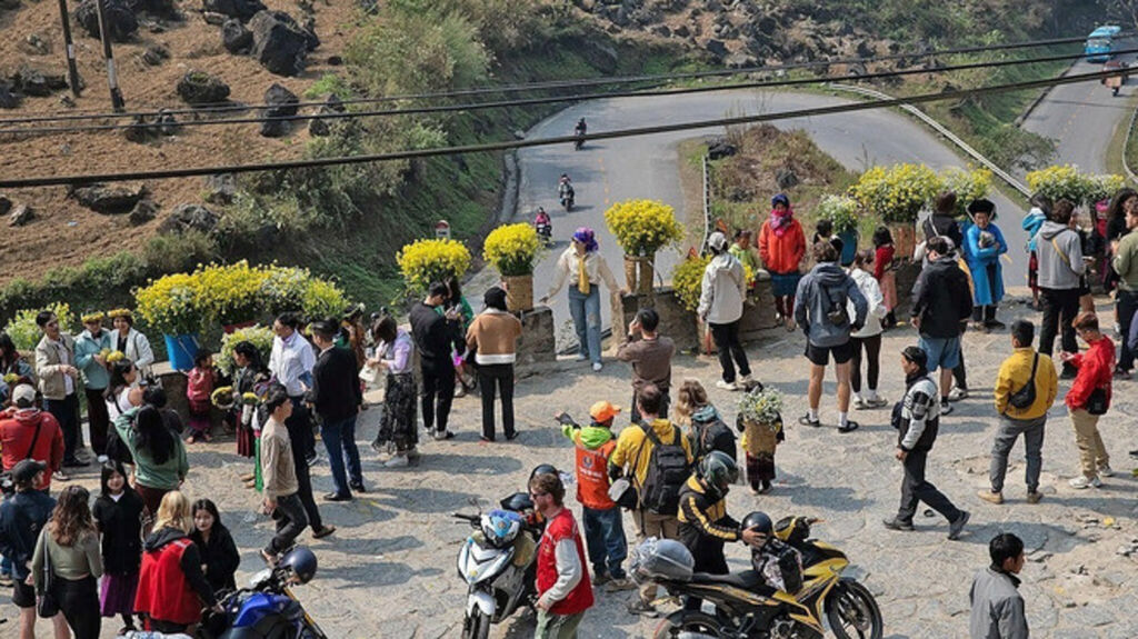 | L’atmosphère animée du col de Thâm Ma, où les motards s’arrêtent pour photographier les vendeurs locaux de mets et de souvenirs. |