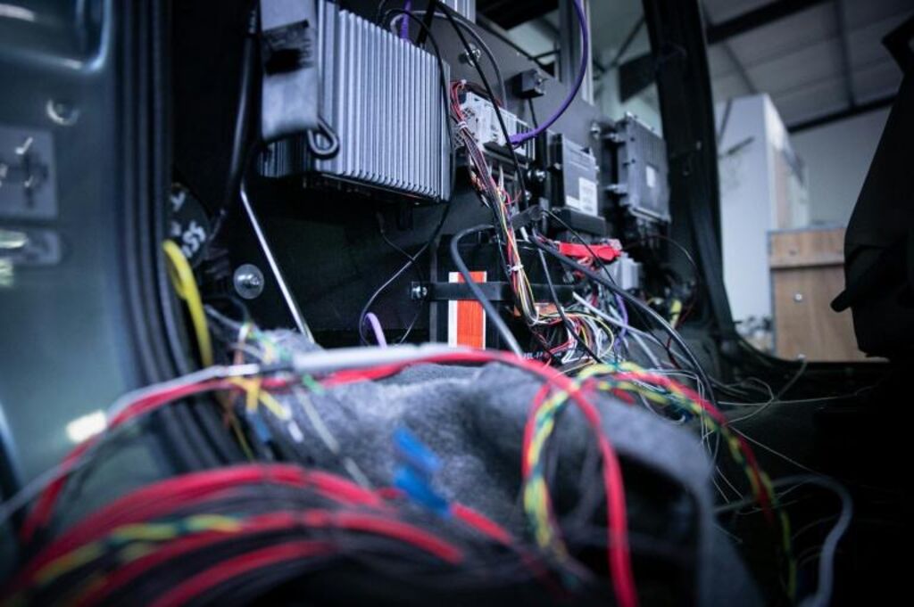 | Les batteries d'une Renault Twingo en cours d'électrification dans un hangar de la start-up Lormauto, le 26 janvier à Hermival-les-Vaux, près de Lisieux, dans le Calvados. |
