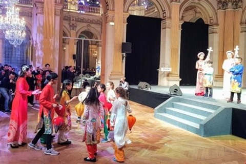 | Un numéro artistique lors de la rencontre organisée le 3 février à Paris à l’occasion du Nouvel An lunaire 2020 et en l’honneur du 90e anniversaire du Parti communiste du Vietnam. |