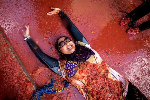 Des participantes asiatiques au festival de la "Tomatina", à Bunol, près de Valence, en 2015. Photo : AFP/VNA/CVN |