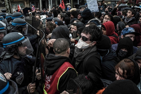 | Les forces de l'ordre encerclent des manifestants contre la loi Travail, le 5 avril à Lyon. |