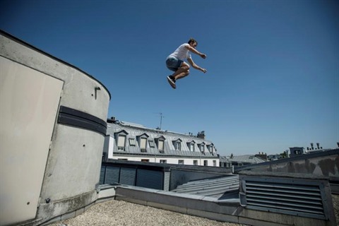 | Le Français Charles Poujade, lors d'un entraînement de parkour, le 19 juillet, sur les toits de Paris. |