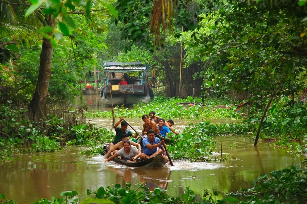 | Photo d’archive montrant des résidents locaux en bateau dans le delta du Mékong. |