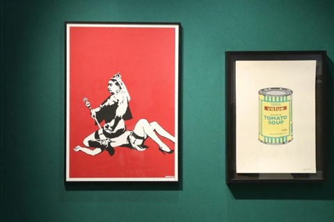 | Les œuvres +Queen Vic+ et +Soup can yellow+ réalisées par l'artiste britannique Banksy exposées à la vente chez Artcurial à Paris, le 24 octobre. |