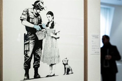 | Une œuvre du street artist Banksy exposée le 18 octobre à Paris avant une vente aux enchères par la maison Artcurial, le 24 octobre. |