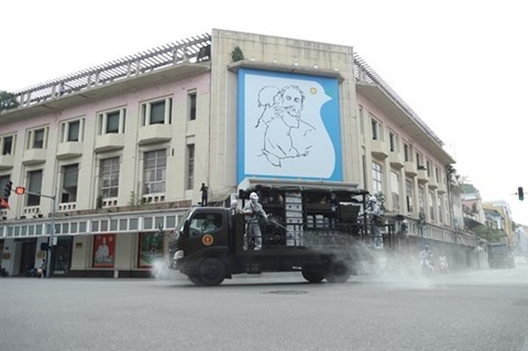 | Désinfection dans une rue de l'arrondissement de Hoàn Kiêm, à Hanoï. |