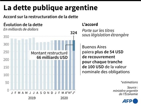 "Nous sommes heureux d'être parvenus à un accord préliminaire avec l'Argentine sur une proposition qui apportera au pays le soulagement économique nécessaire" en cette période de pandémie, se sont réjouis à leur tour dans un communiqué les trois principaux groupes de créanciers, Exchange Bondholders, Ad Hoc et Argentina Creditor Committee. La directrice générale du Fonds monétaire international (FMI), Kristalina Georgieva, a salué sur Twitter "un pas très important". "Nous espérons une conclusion heureuse, dans l’intérêt de toutes les parties", a-t-elle ajouté. Les deux parties ont désormais vingt jours, jusqu'au 24 août, pour finaliser les détails de l'accord.
