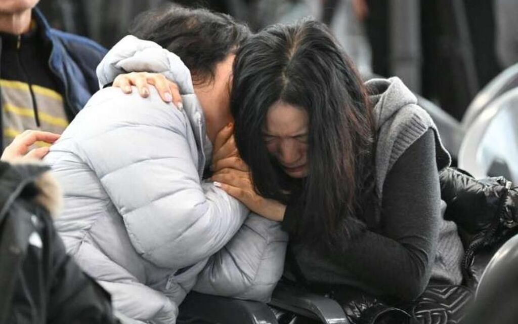 | Des proches de passagers du Boeing 737-800 de Jeju Air qui s'est écrasé pleurent à l'aéroport international de Muan, dans le Sud-Ouest de la Corée du Sud, le 30 décembre. |