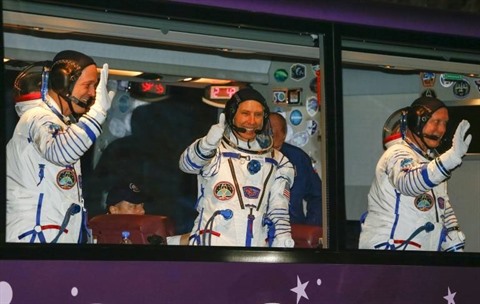 | Les deux astronautes Drew Feustel et Richard Arnold et le cosmonaute Oleg Artemiev peu avant leur décollage du cosmodrome de Baïkonour le 21 mars. |