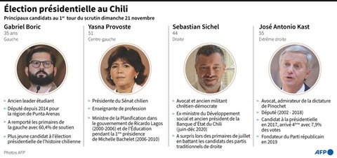 Parmi les deux favoris des derniers sondages, crédités d'environ un quart des intentions de vote, on trouve deux candidats situés aux extrêmes du paysage politique et en dehors des coalitions de droite et de centre gauche qui ont gouverné le pays depuis la fin de la dictature d'Augusto Pinochet (1973-1990).