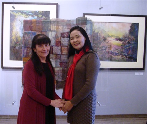 | Les artistes vietnamienne Trân Thanh Thuc (droite) et française Catherine Juillerat prennent la pose pour leur exposition. |