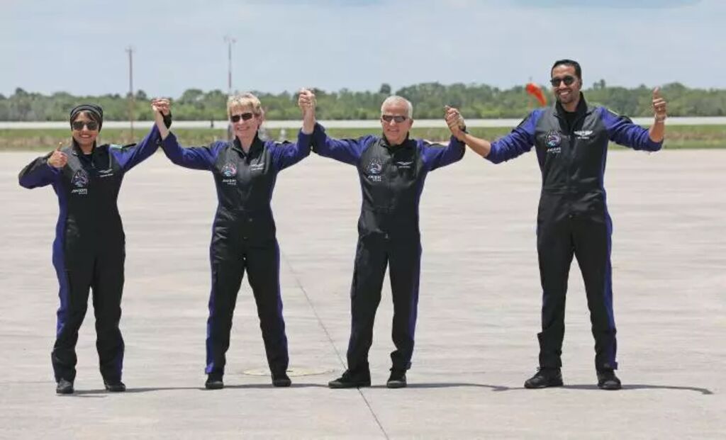 | De gauche à droite : Rayana Barnawi, Peggy Whitson, John Shoffner et Ali Al-Qarni avant leur départ vers la Station spatiale internationale, le 21 mai à Cap Canaveral. |