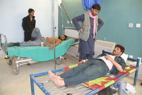 | Des Afghans blessés lors de deux attaques à la voiture piégée, le 17 octobre à l'hôpital de Gardez. |
