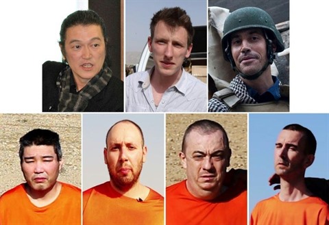 | Photomontage de victimes décapitées par "Jihadi John" : Kenji Goto, Peter "Abdel-Rahman" Kassig, James Foley, Haruna Yukawa, Steven Sotloff, Alan Henning et David Haines. |