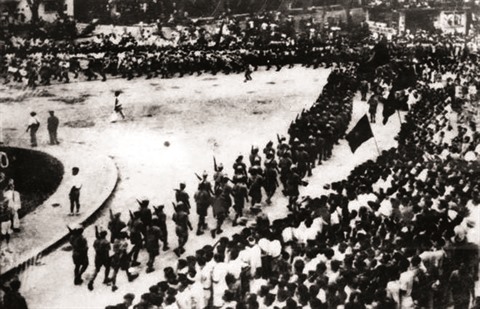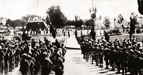 | Défilé de troupes de libération sur la place devant l’Opéra de Hanoï, le 28 août 1945. |