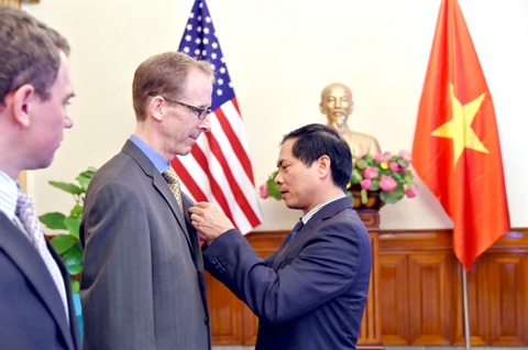 | Le vice-ministre vietnamien des Affaires étrangères, Bùi Thanh Son, remet, le 14 juin à Hanoi, des insignes au directeur de l'USAID, Joakim Parker. |