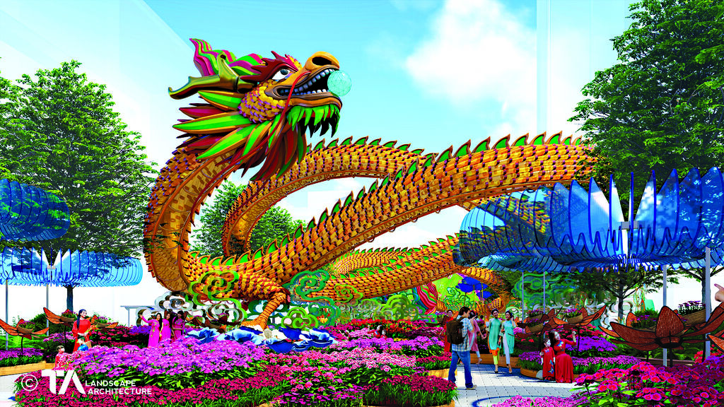 La rue florale Nguyên Huê 2024 fait une forte impression dès la porte d’entrée avec une paire de dragons portant le nom “Luong Long Triêu Liên” (deux dragons flanquant le lotus), chacun s’enroulant des deux côtés de la rue florale, avec une longueur de plus de 100 m et un tour de tête de plus de 2 m. En plus d’établir un record de taille pour l’animal du zodiaque dans la rue florale, la mascotte de cette année a été également conçue pour être respectueuse de l’environnement, puisque plus de 90% des matériaux utilisés sont en bambou ou rotin.
