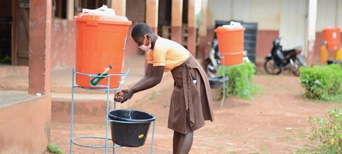 | Une jeune fille au Ghana se lave les mains avant de retourner en classe. |