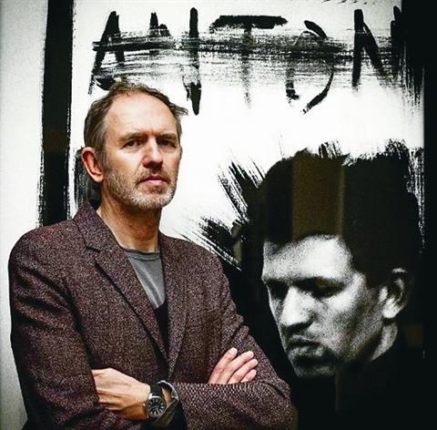 | Le photographe Anton Corbijn pose en face d’un auto-portrait exposé au Gemeentemuseum à La Haye. |