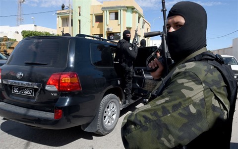 | Les forces spéciales tunisiennes le 7 mars 2017 à Ben Guerdane, pendant la commémoration des attaques de l'an dernier qui avaient fait 13 morts. |