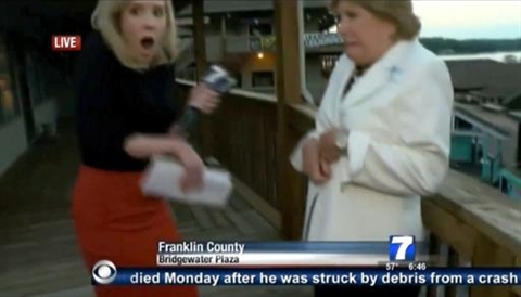 | Une capture d'écran de la télévision WDBJ7-TV montre Alison Parker (gauche) juste au moment où elle entend un coup de feu alors qu'elle interviewait Vicki Gardner, la directrice locale de la Chambre du commerce à Roanoke en Virginie, le 26 août. |