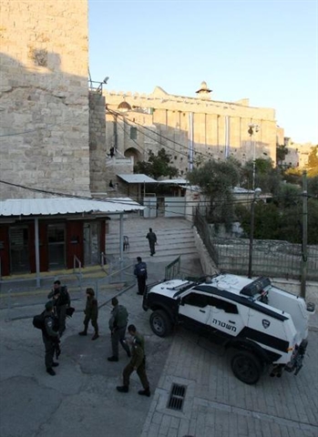 | Des membres des forces de sécurité israéliennes sur les lieux où un Palestinien a été abattu après avoir poignardé un policier israélien près du tombeau des Patriarches à Hébron, dans le Sud de la Cisjordanie occupée, le 25 avril. |