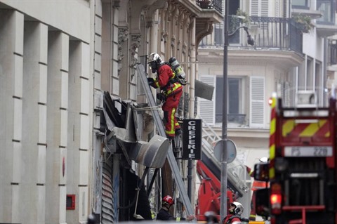 | Des pompiers sur les lieux d'une explosion qui s'est produite dans une boulangerie, le 12 janvier dans le 9e arrondissement de Paris. |