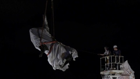 En plein milieu de la nuit, des ouvriers municipaux ont retiré à l'aide d'une grue une statue enveloppée dans une bâche blanche, située dans le parc Grant.