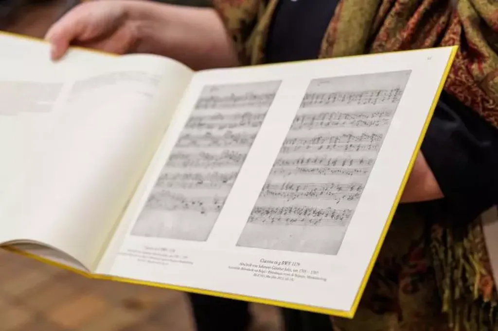 | Un employé des Archives de Bach tient les deux oeuvres finalement attribuées au compositeur Jean-Sébastien Bach, après plus de 30 ans de recherche, lors de leur présentation à l'église Saint-Thomas de Leipzig le 17 novembre 2025. |