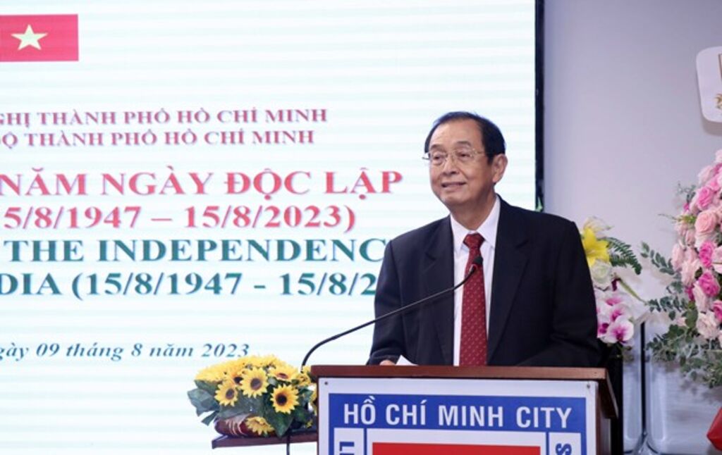 | Le président de l'Association d'amitié Vietnam - Inde de Hô Chi Minh-Ville, Huynh Thành Lâp, lors d'une cérémonie marquant le 76e anniversaire du Jour de l’indépendance de l'Inde. |
