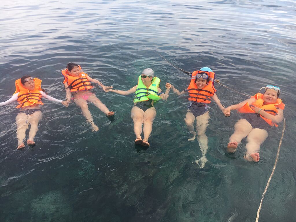 | Les touristes s'immergent dans l'eau bleue de la mer. |