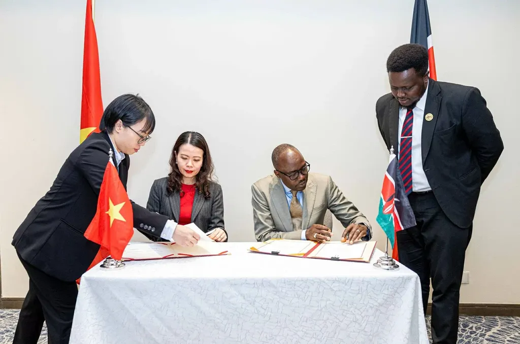 | La vice-ministre vietnamienne des Affaires étrangères, Nguyên Minh Hang, et le secrétaire principal en charge des Affaires étrangères au ministère kényan des Affaires étrangères et de la Diaspora, Abraham Korir Sing’Oei, signent un mémorandum sur un mécanisme de consultation politique entre les deux ministères. |