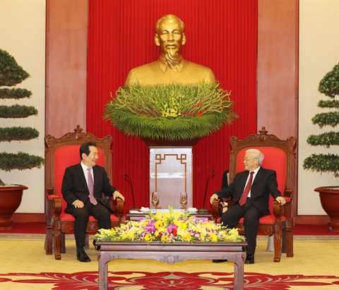 | Le secrétaire général du Parti communiste du Vietnam Nguyên Phu Trong (droite) et le président de l’Assemblée nationale sud-coréenne Chung Sye-kyun, le 25 avril à Hanoï. |