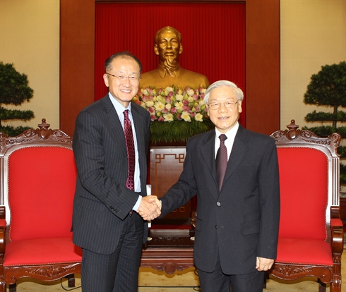 | Le secrétaire général du Parti communiste du Vietnam, Nguyên Phu Trong (droite), et le président du Groupe de la Banque mondiale, Jim Yong Kim, le 17 juillet à Hanoi. |