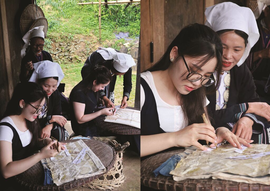 | Les femmes Dao aux sapèques pratiquent le dessin à la cire d'abeille (techniques du batik) pour embellir leurs produits cousus à la main.  |