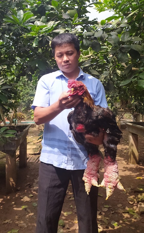 | Lê Quang Thang, directeur de la Coopérative d’élevage et de commerce du poulet de Dông Tao, et son poulet. |