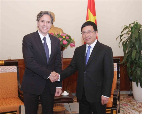 | Le vice-Premier ministre et ministre des Affaires étrangères Pham Binh Minh (droite) et le premier adjoint du secrétaire d’État américain Antony Blinken, le 18 mai à Hanoi. |