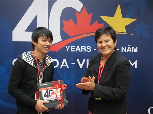 | L’ambassadrice du Canada au Vietnam, Deborah Chatsis (droite), et le concepteur du logo gagnant, Pham Công Tuân, le 19 décembre à Hanoi. |